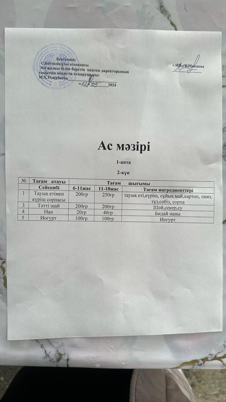 12.03.2024ж 1-4 сынып оқушыларының ас мәзірі