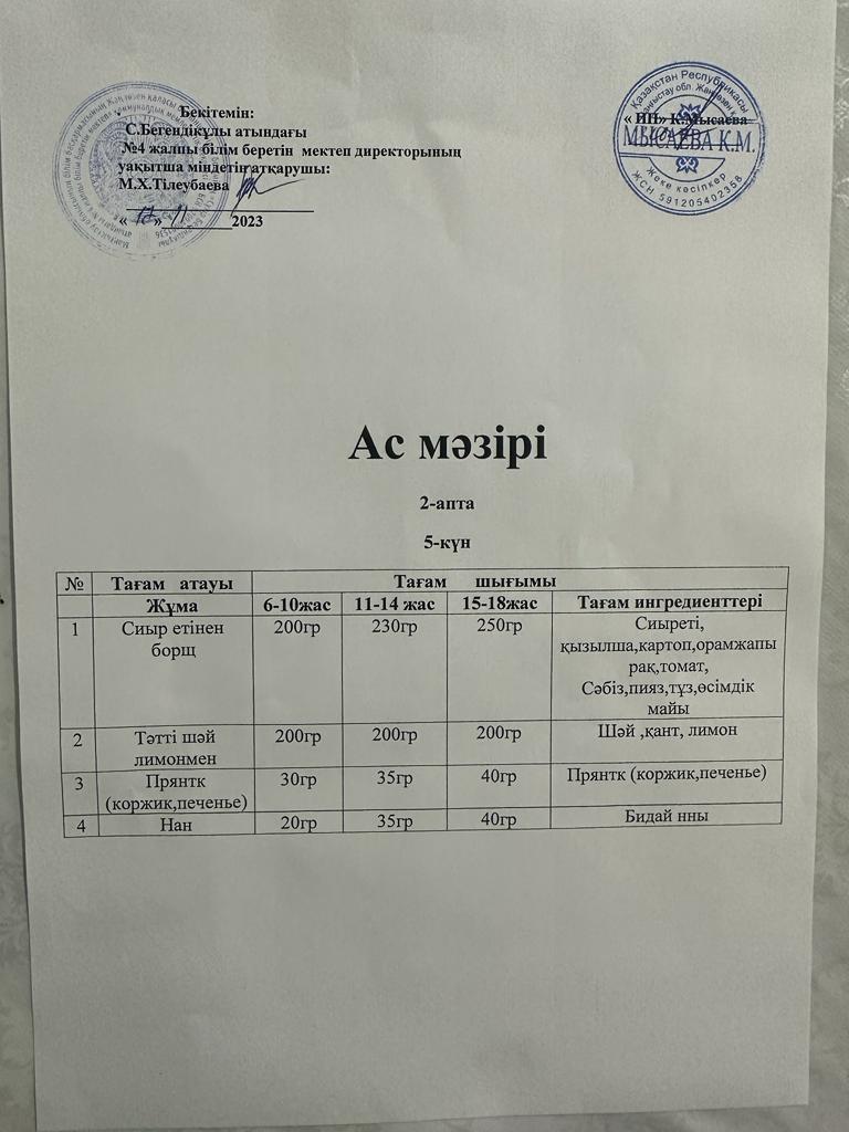 17.11.2023 ж 1-4 сынып оқушыларының ас мәзірі