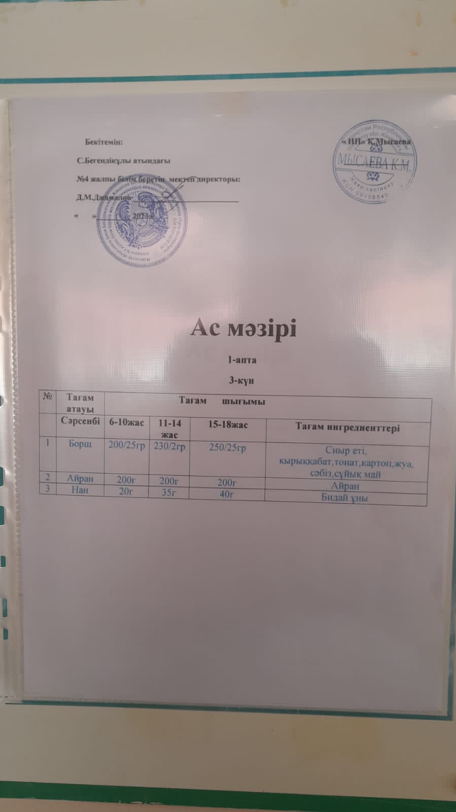 20.09.2023ж 1-4сынып оқушыларының ас мәзірі