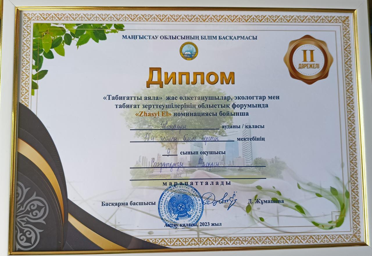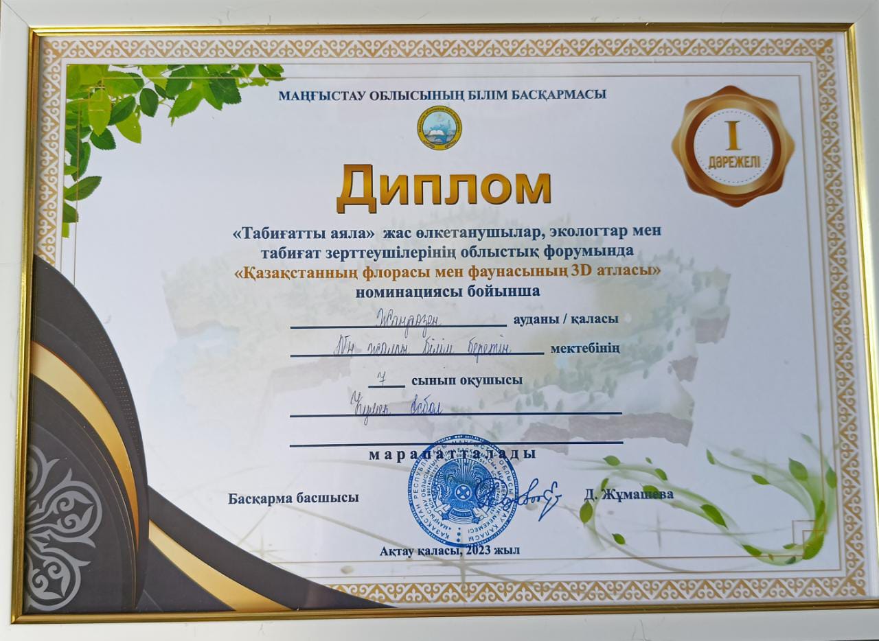 2023 жылдың 26-27 сәуір күндері "Табиғатты аяла" атты жас өлкетанушылар, экологтар мен табиғат зерттеушілерінің облыстық форумында Жаңаөзен қаласы Сүгір Бегендікұлы атындағы N4 жалпы білім беретін мектептің 7"А"сынып оқушысы Кумек Есбол " Қазақстанның флорасы мен фаунасының 3D атласы" номинациясы бойынша 1орын, 9"В"сынып оқушысы Сағдат Толқын " Zhasyl EL" номинациясы бойынша 2 орын, GREEN QASES" номинациясы бойынша 9"В" сынып оқушысы Кумек Ақкербез 2 орын, "Туған өлкенің бояулары" номинациясы бойынша 8 "А" сынып оқушысы Қасыбай Айару 3 орындарды иеленіп, мектебімізді қуанышқа бөледі. 1- орынды иеленген Кумек Есбол республикалық байқауға жолдама алды. Дайындаған ұстаздары Тегисбаева Жұлдыз, Алибекова Жұмабибі, Сүйеуова Айгүлге алғысымыз шексіз, республикадан да жүлделі орынды иеленуіне тілектеспіз, Кумек Есболға сәттілік тілейміз.