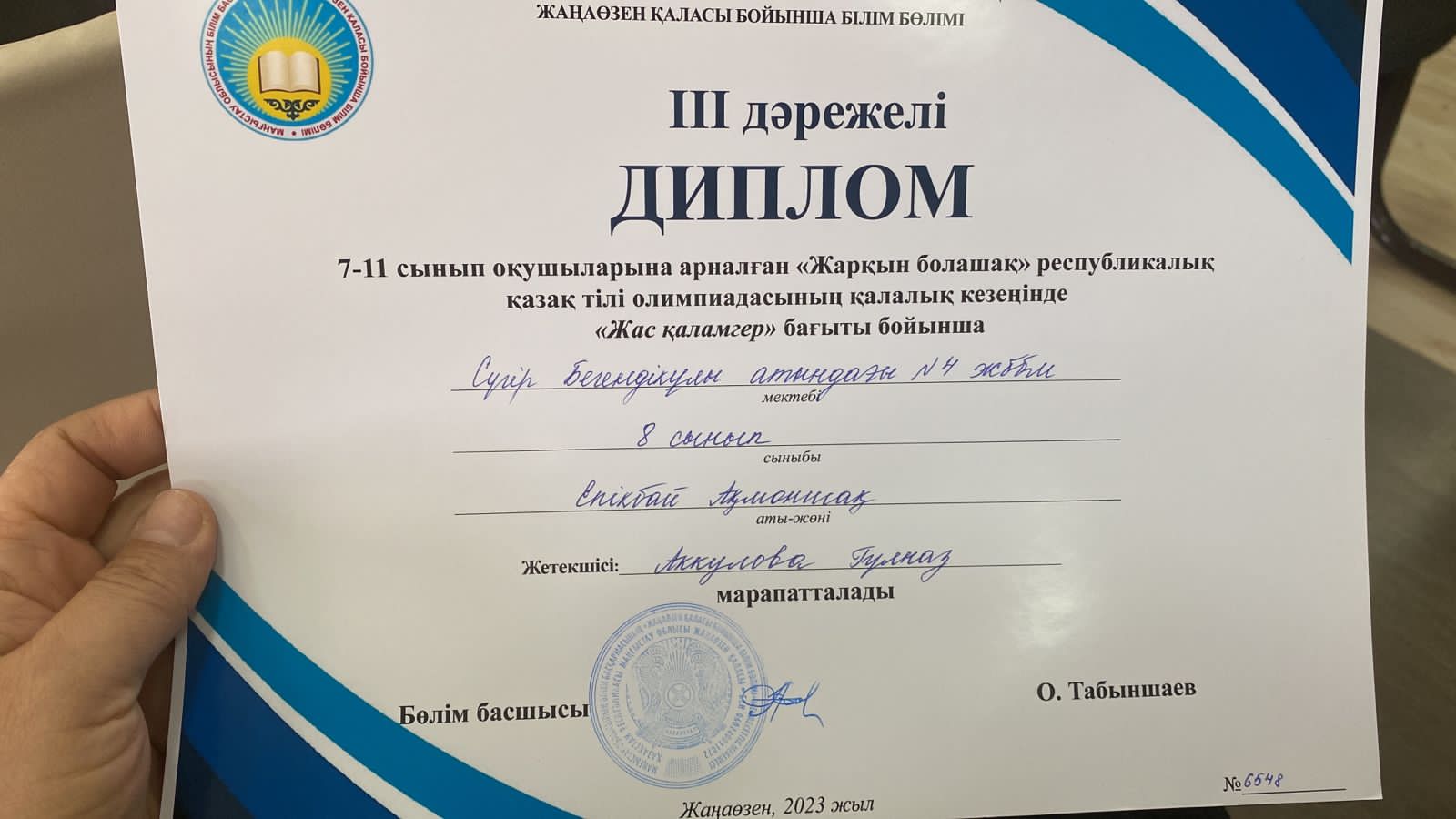 18.04.2023 жылы Жаңаөзен қаласы бойынша жалпы білім беретін мектептердің арасында 7-11 сынып оқушыларына арналған "Жарқын болашақ" республикалық қазақ тілі олимпиадасының қалалық кезеңінде "Жас қаламгер" бағыты бойынша 8"А"сынып оқушысы Епікбай Ақмоншақ жүлделі III орынды, "Бейнелеушілер" бағыты бойынша 9 "А" сынып оқушысы Асылбек Ардақ IV орынды, "Әнші бұлбұлдар" бағыты бойынша 9 "Б" сынып оқушысы Құлбай Аделя IV орынды иеленді. Оқушыларымыз бен дайындаған мұғалімдері Қожахметова Гаухар, Аккулова Гүлназды құттықтаймыз, биік белестерді бағындыра беруіне тілектеспіз