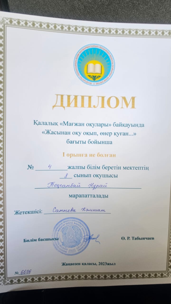 20.04.2023 күні Жаңаөзен қаласы жалпы білім беретін мектеп оқушылары арасында өткізілген қалалық "Мағжан оқулары" байқауында "Жасынан оқу оқып, өнер қуған" бағыты бойынша Сүгір Бегендікұлы атындағы N 4 жалпы білім беретін мектептің 8"В" сынып оқушысы Тоқсанбай Нұрай жүлделі I орынды иеленді, дайындаған пән мұғалімі Сатыева Камшат пен Нұрайға алғысымыз шексіз, алдағы уақытта бағындырар белесі көп болғай.