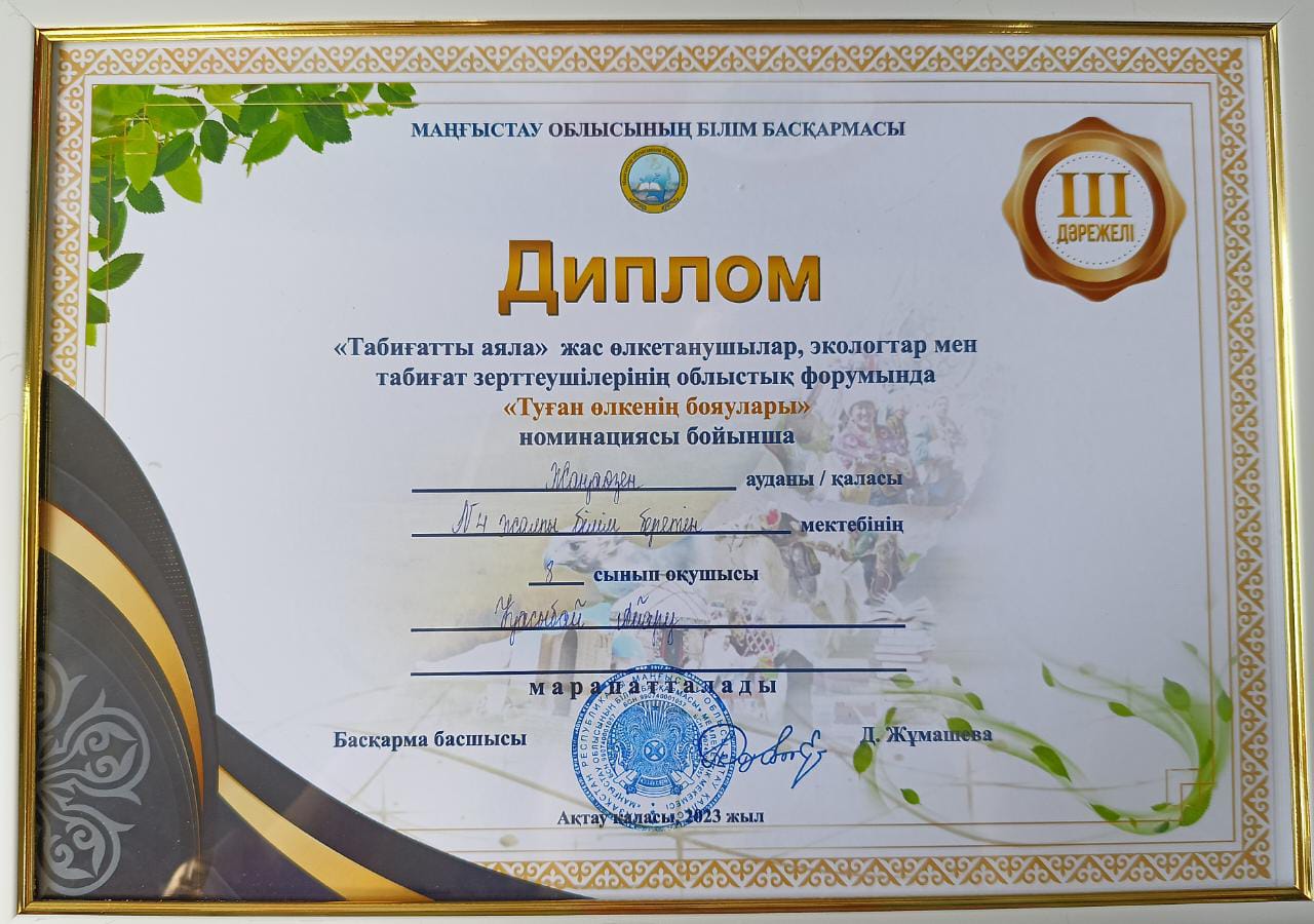 2023 жылдың 26-27 сәуір күндері "Табиғатты аяла" атты жас өлкетанушылар, экологтар мен табиғат зерттеушілерінің облыстық форумында Жаңаөзен қаласы Сүгір Бегендікұлы атындағы N4 жалпы білім беретін мектептің 7"А"сынып оқушысы Кумек Есбол " Қазақстанның флорасы мен фаунасының 3D атласы" номинациясы бойынша 1орын, 9"В"сынып оқушысы Сағдат Толқын " Zhasyl EL" номинациясы бойынша 2 орын, GREEN QASES" номинациясы бойынша 9"В" сынып оқушысы Кумек Ақкербез 2 орын, "Туған өлкенің бояулары" номинациясы бойынша 8 "А" сынып оқушысы Қасыбай Айару 3 орындарды иеленіп, мектебімізді қуанышқа бөледі. 1- орынды иеленген Кумек Есбол республикалық байқауға жолдама алды. Дайындаған ұстаздары Тегисбаева Жұлдыз, Алибекова Жұмабибі, Сүйеуова Айгүлге алғысымыз шексіз, республикадан да жүлделі орынды иеленуіне тілектеспіз, Кумек Есболға сәттілік тілейміз.