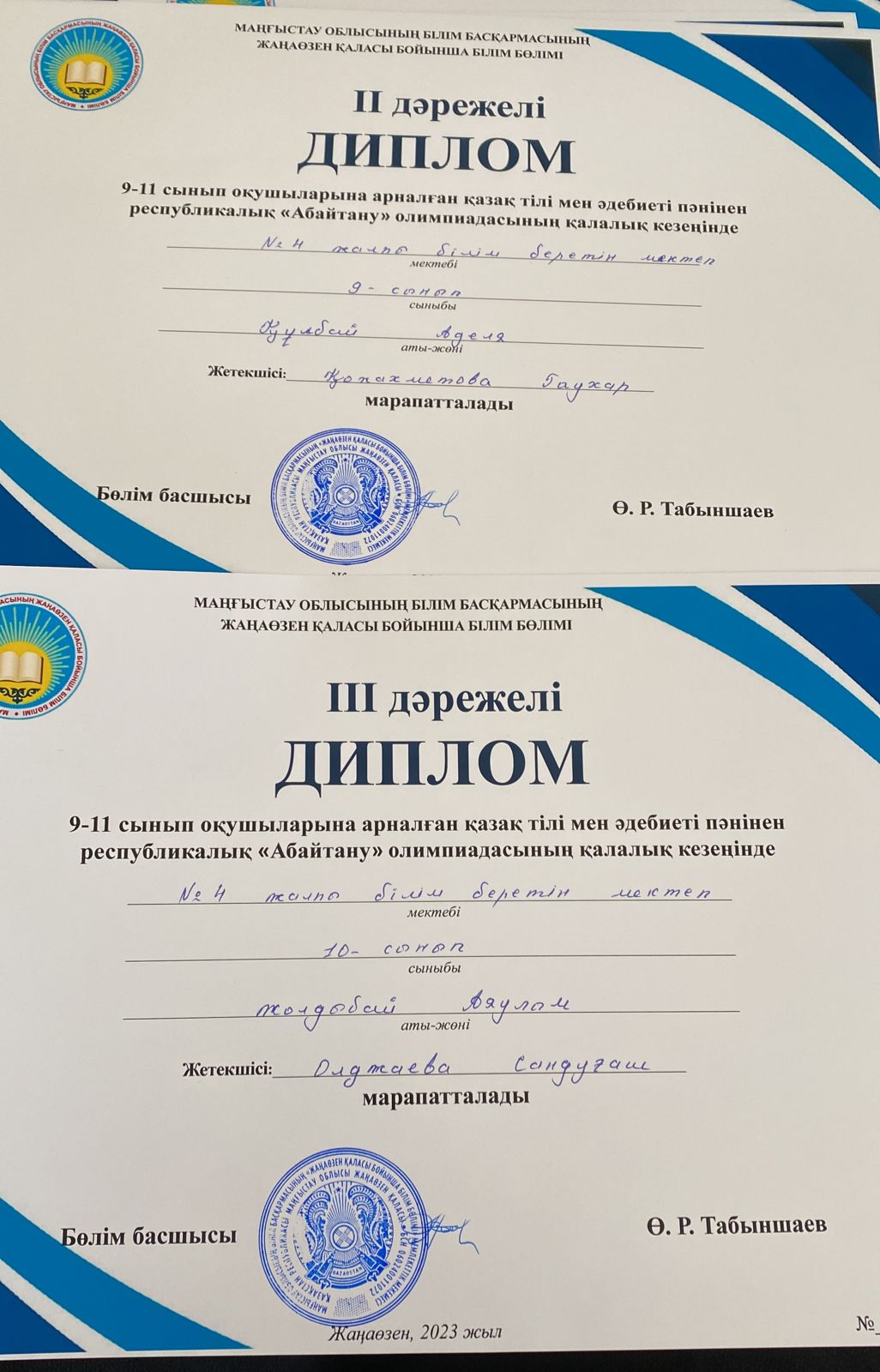 19.04.2023 жылы Жаңаөзен қаласы бойынша жалпы білім беретін мектептердің 9-11 сынып оқушылары арналған қазақ тілі мен әдебиеті пәнінен республикалық "Абайтану" олимпиадасы болып өтті. Олимпиадағы мектебімізден қатысқан 9"Б" сынып оқушысы Құлбай Аделя жүлделі II орынды, 10"Б" сынып оқушысы Жолдыбай Аяулым III орынды иеленді. Оқушыларымыз бен дайындаған ұстаздары Қожахметова Гаухар мен Олджаева Сандуғашқа алғысымыз шексіз, жетістіктерге жете берулеруіңізге тілектеспіз